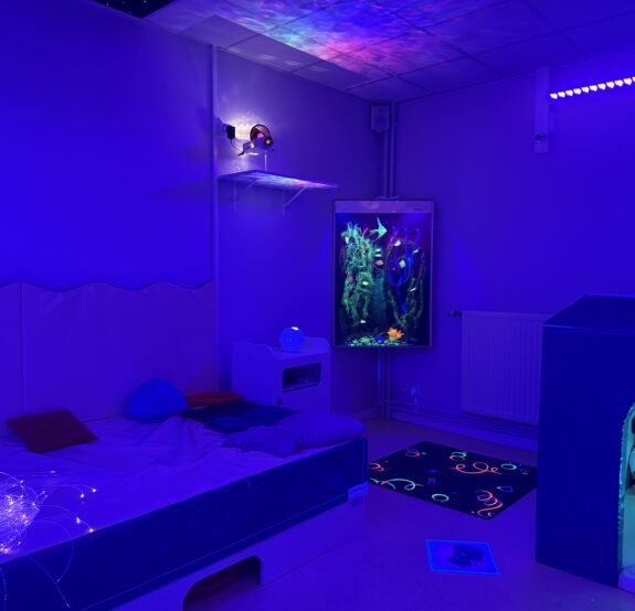 Le Snoezelen est une approche multisensorielle destinée à favoriser le bien-être, la relaxation et l’apaisement. Grâce à des jeux de lumières, des textures, des sons doux ou encore des dispositifs interactifs, cette salle permet :